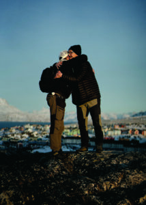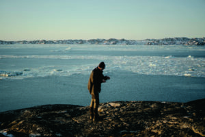 Vi kører op til toppen af Nuuk og stiger ud af bilen til postkortudsigt over bydelen Myggedalen med de klassiske, små, farvede huse mod sydvest og den isbelagte fjord, der strækker sig ind mod indlandsisen så langt øjet rækker. Solen er på vej ned, og det orange skær rammer Kims kinder, da han åbner sin telefon for at tage billeder.